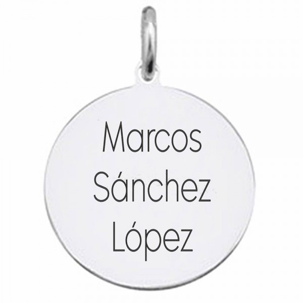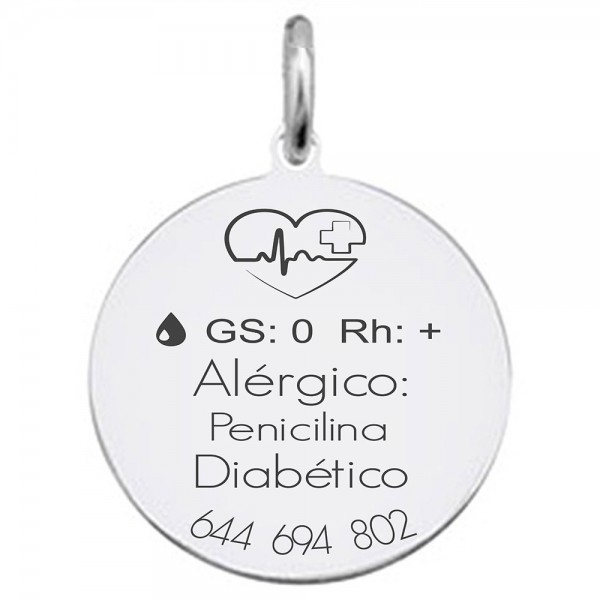 Medalla redonda de plata de 20mm, 23mm (+1€) y 27mm (+6€) con un grosor de 0,5-0,6 mm para colgante personalizado de alerta médica. Colgante de plata de ley grabado con dibujo de un corazón con constantes vitales, una gota de sangre junto al grupo sanguíneo de la persona, y en texto grabadas las alergias o datos médicos importantes. El texto y los dibujos se graban con láser en nuestro taller del sur de Madrid (Parla) y está incluido en el precio.