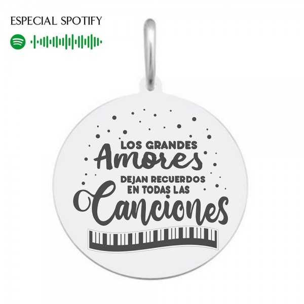 Medalla redonda de 20mm (1,20mm de grosor), 25mm (1,60mm de grosor, por 2€ más ) o 30mm (1,50mm de grosor, por 4€ más) para colgante personalizado grabado con un código de Spotify con música que esconde una canción, playlisto podcast en la parte trasera de la medalla y la frase "LOS GRANDES Amores DEJAN RECUERDOS EN TODAS LAS Canciones" y el dibujo de las teclas de un piano en la cara delantera. El texto y los dibujos se graban con láser en nuestro taller del sur de Madrid (Parla) y está incluido en el precio.