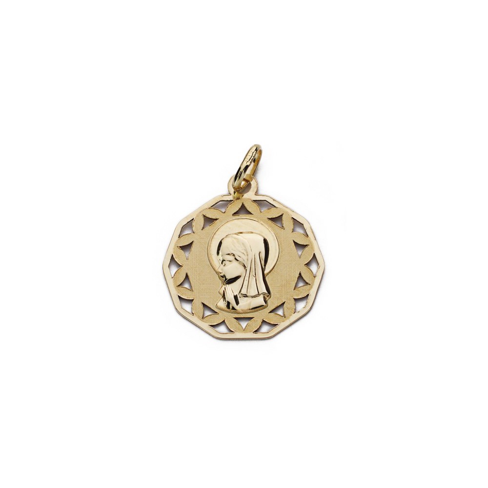 Medalla de la silueta de la Virgen niña en relieve redonda con bonitas formas caladas en el bisel y toques satinados en el fondo, con forma de decágono o con 10 lados.