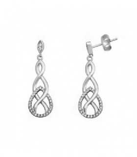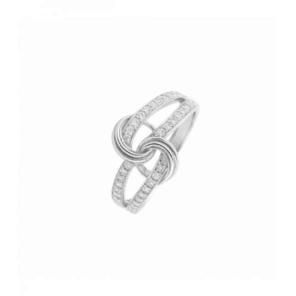 Presenta un diseño cruzado tipo lazo o nudo en la parte central, símbolo de unión y estilo. Sus brazos están decorados con circonitas que aportan luminosidad y realzan la pieza con un toque sofisticado.