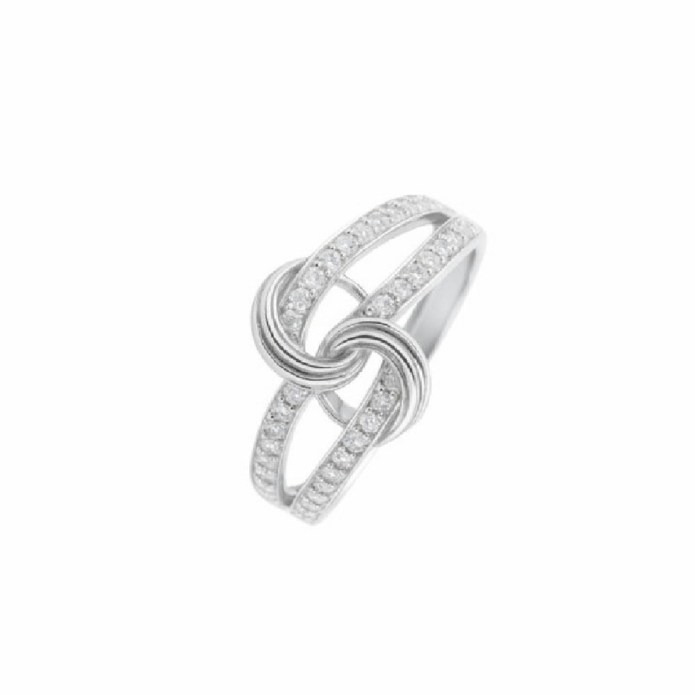 Anillo en plata de ley 925 con diseño cruzado tipo lazo y brazos decorados con circonitas. Disponible en varias tallas. Consultar medidas por WhatsApp 644694802. Se entrega en caja para regalo.