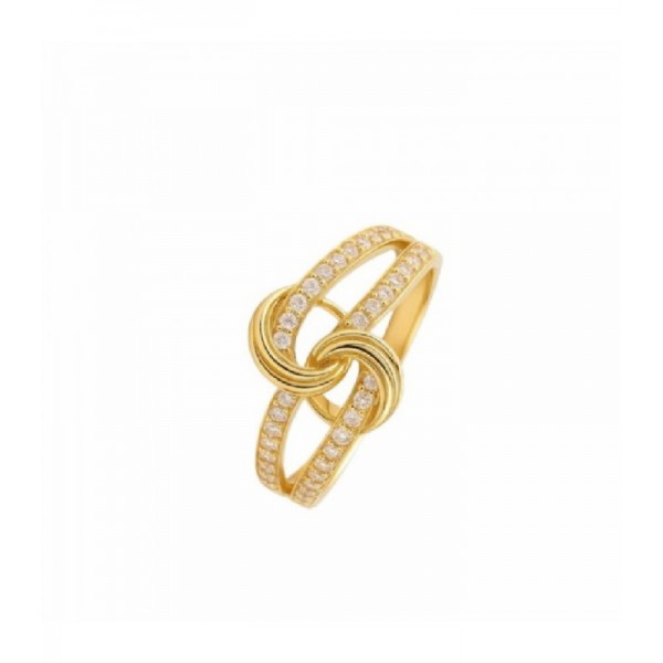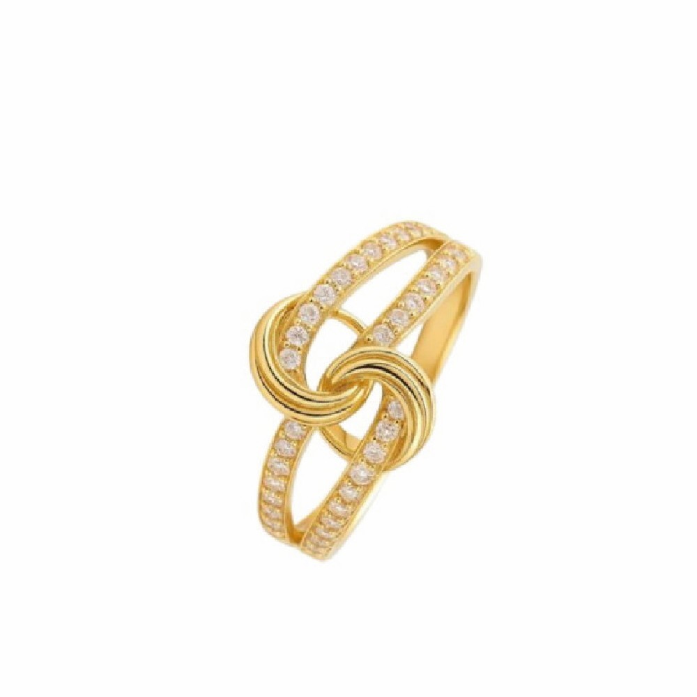 El anillo presenta un delicado diseño entrelazado tipo lazo o nudo en la parte central, símbolo de unión y elegancia. Los brazos están decorados con circonitas que aportan luminosidad y realzan la pieza.