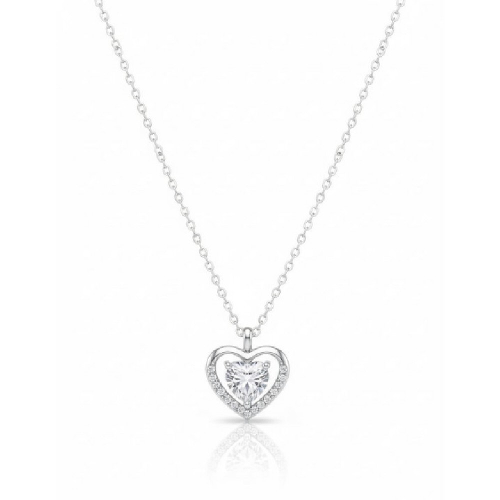 En el centro destaca una circonita de mayor tamaño tallada en forma de corazón y engastada con garras, aportando un brillo intenso y una presencia especial que capta la luz con cada movimiento.